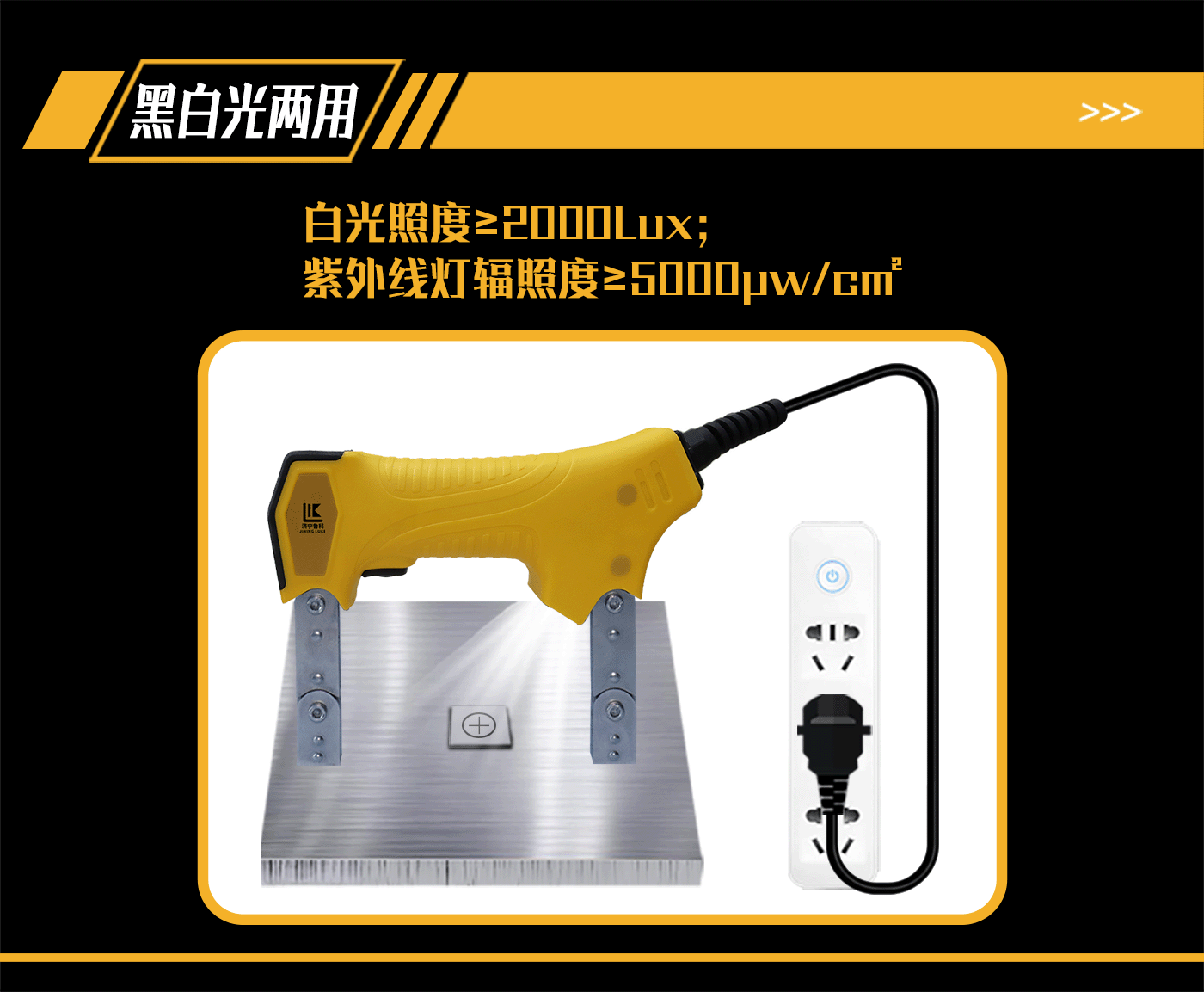 2、D型探頭具有紫外線、白光照明模式,采用按鍵切換;可以熒光磁粉探傷及普通磁粉探傷。