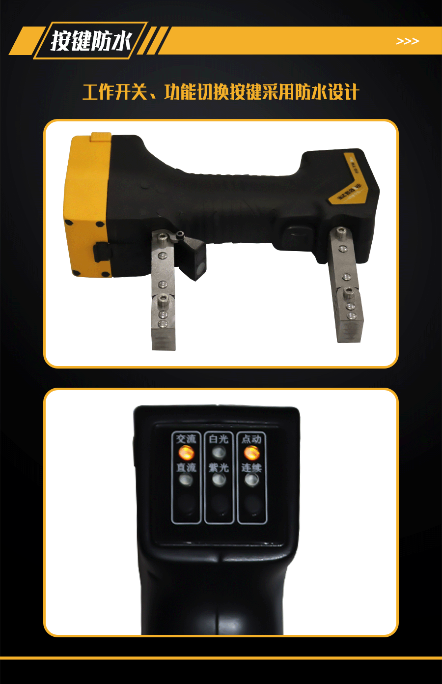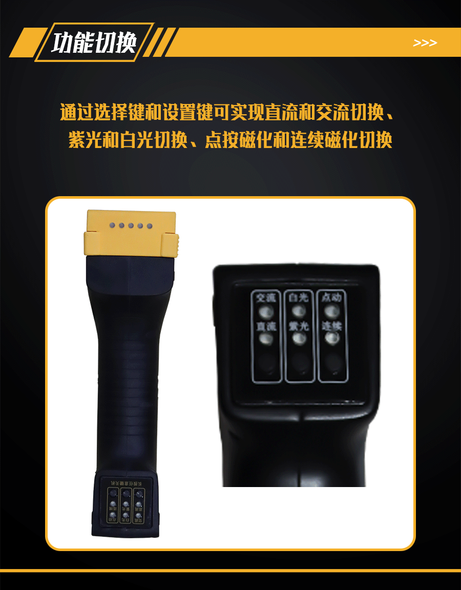 4.磁軛配有防水防油磁化按鍵和交直流、黑白光功能、點(diǎn)按和連續(xù)磁化切換按鍵。