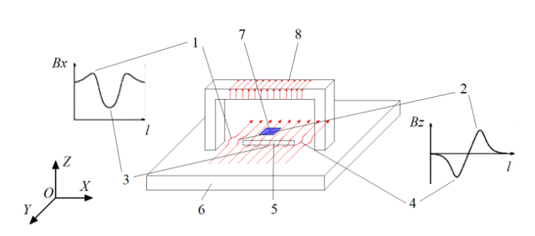 1-電流在裂紋兩端聚集時(shí),Bx出現(xiàn)凸起;2-電流在裂紋尖端順時(shí)針旋轉(zhuǎn)時(shí),Bz出現(xiàn)波峰;3-電流從裂紋底部通過(guò)時(shí),Bx出現(xiàn)波谷;4-電流在裂紋尖端逆時(shí)針旋轉(zhuǎn)時(shí),Bz出現(xiàn)波谷;5-缺陷;6-待檢工件;7-傳感器;8-激勵(lì)線圈。