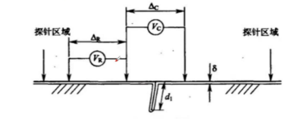 ACPD技術(shù)的原理并非基于電磁感應(yīng),而是利用交流電的趨膚效應(yīng)。最簡(jiǎn)單的ACPD檢測(cè)系統(tǒng)由兩根探針構(gòu)成。檢測(cè)時(shí),需先打磨待測(cè)區(qū)域,然后在區(qū)域兩側(cè)分別放置探針,并施加不同電壓的交流電。此時(shí),探針、儀器與檢測(cè)區(qū)域共同構(gòu)成閉合回路,電流從高電勢(shì)探針流向低電勢(shì)探針。由于趨膚效應(yīng),若檢測(cè)區(qū)域無(wú)缺陷,電流流經(jīng)的路徑長(zhǎng)度即為兩探針之間的距離;若存在表面開(kāi)口缺陷,電流路徑將增加約兩倍的缺陷深度。路徑長(zhǎng)度的變化可通過(guò)兩探針間的電壓變化來(lái)表征,并由儀器記錄,見(jiàn)圖2。