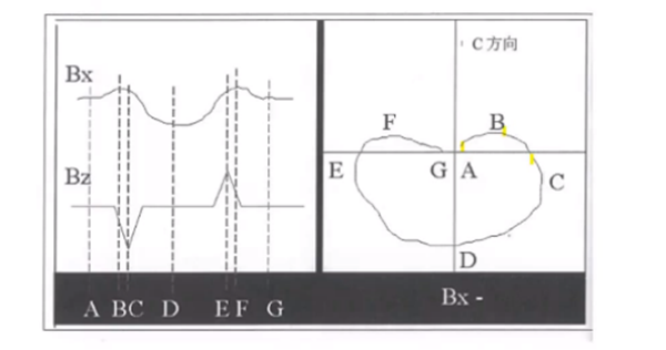 1-電流在裂紋兩端聚集時,Bx出現(xiàn)凸起;2-電流在裂紋尖端順時針旋轉(zhuǎn)時,Bz出現(xiàn)波峰;3-電流從裂紋底部終過時,Bx出現(xiàn)波谷;4-電流在裂紋尖端逆時針旋轉(zhuǎn)時,Bz出現(xiàn)波谷;5-缺陷;6-待檢工件;7-傳感器;8-激勵線圈。