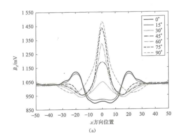 ACFM原理中,當(dāng)裂紋的走向與探頭的掃查方向平行時,ACFM檢測系統(tǒng)的檢測靈敏度最高,但在實際檢測中,裂紋的走向未知。因此,對于不同走向的裂紋,ACFM的信號應(yīng)具有不同的響應(yīng),如圖5-7所示。