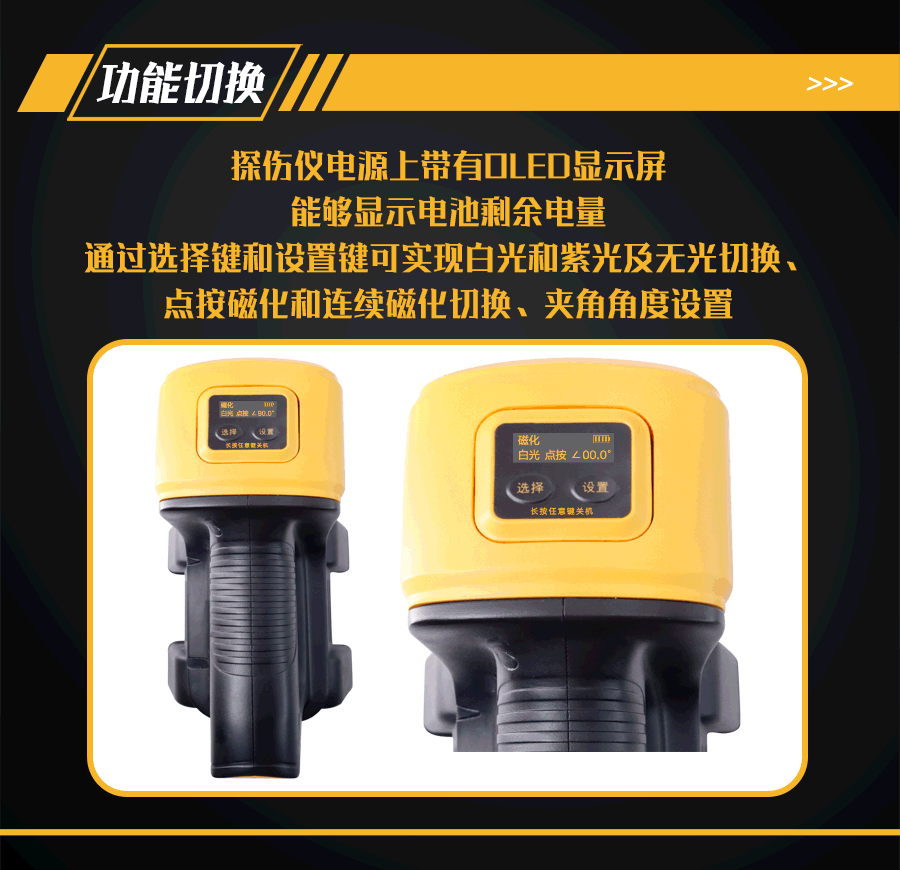 4、鋰電池電源帶有OLED顯示屏及操作按鍵;可顯示及設(shè)置剩余電量和電壓、點(diǎn)按磁化或連續(xù)磁化工作模式、紫外線或白光照明模式;